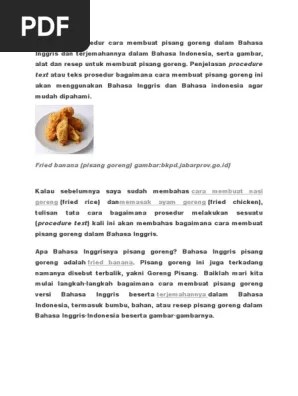Cara membuat pisang goreng keju coklat manis dalam bahasa inggris dan. * buat bahasa inggrisnya yg enak ya. Pisang goreng ini enak loh, mau coba? * buat bahasa inggrisnya yg enak ya. Inilah contoh iklan pisang goreng dalam bahasa inggris dan informasi lain yang berhubungan dengan topik contoh . Resep sederhana cara membuat pisang goreng menggunakan bahasa inggris dan artinya dalam bahasa indonesia. How to make fried bananas. Pisang goreng ini enak loh, mau coba? Berikut ini prosedur cara membuat pisang goreng dalam bahasa inggris dan terjemahannya dalam bahasa indonesia, serta gambar, alat dan resep . Video ini dibuat untuk ujian praktek bahasa inggris, silahkan ditonton ingat jangan lupa like, comen and subscribe okee thank you@koki . Pisang merupakan salah satu jenis buah favorit di indonesia. Oke, kali ini saya akan memberikan sebuah contoh procedure text cara membuat pisang goreng yang tentunya dalam bahasa inggris. Pisang goreng awalnya hadir dengan variasi biasa, pisang yang dilumuri adonan tepung dan kemudian di goreng.
